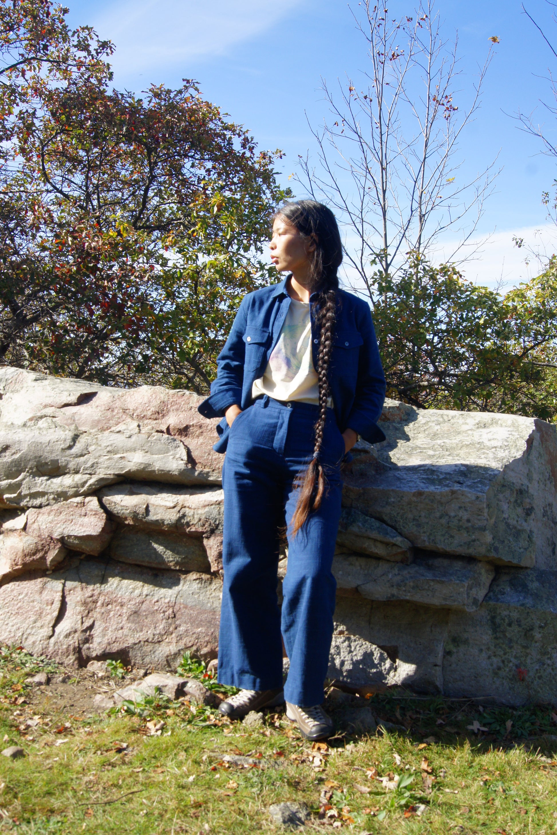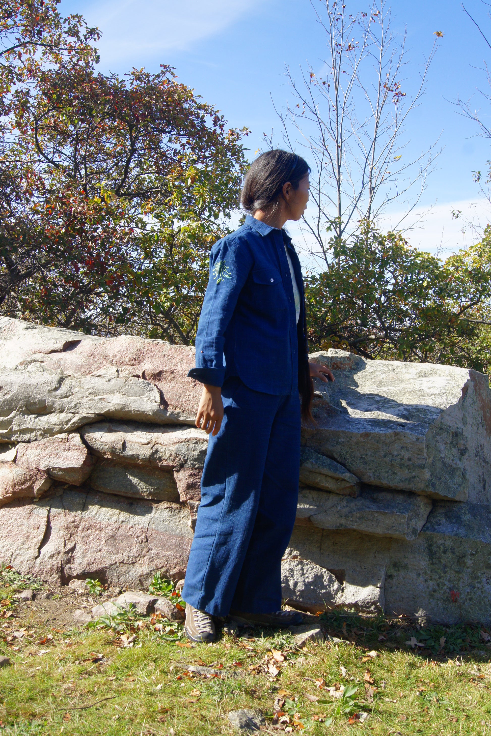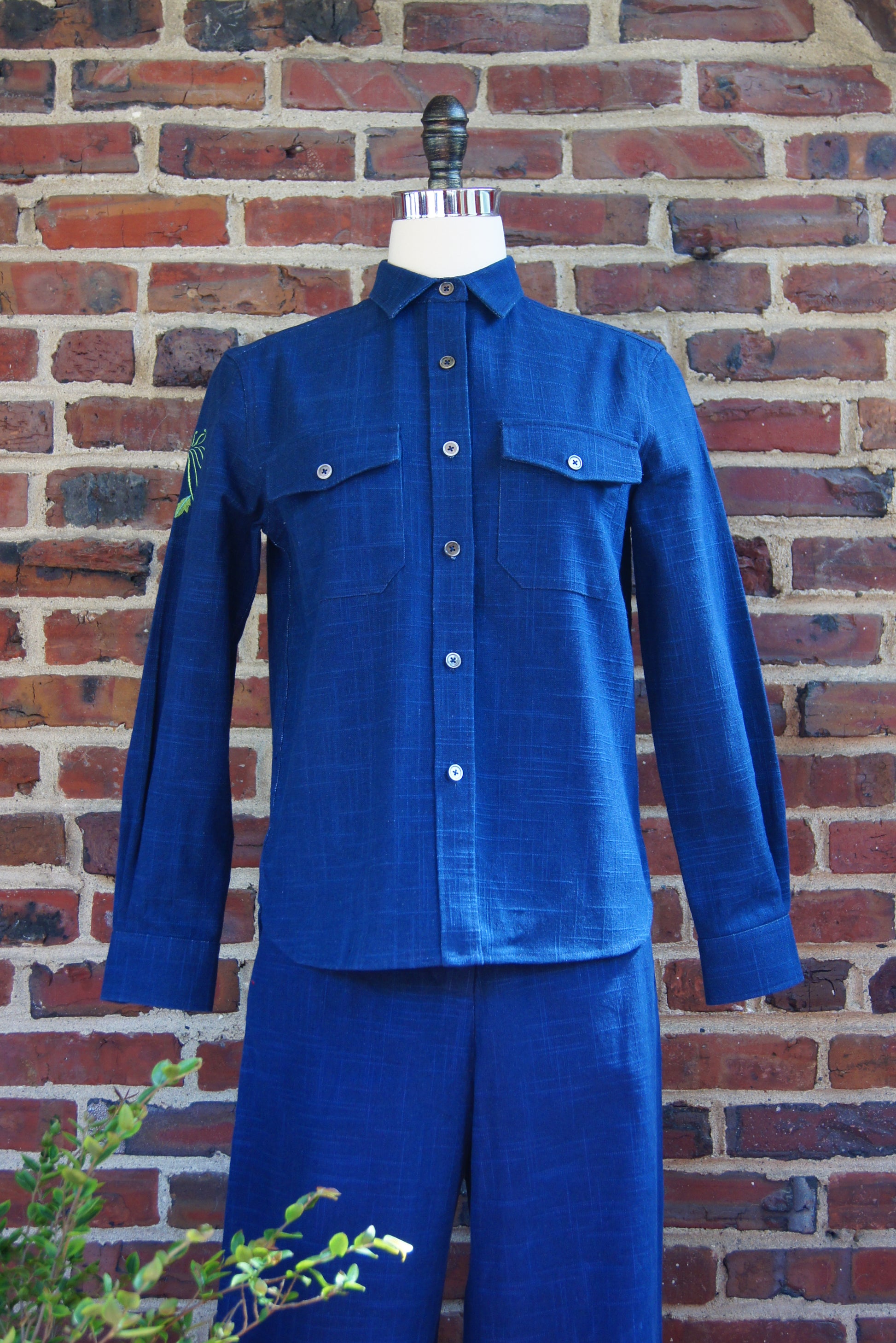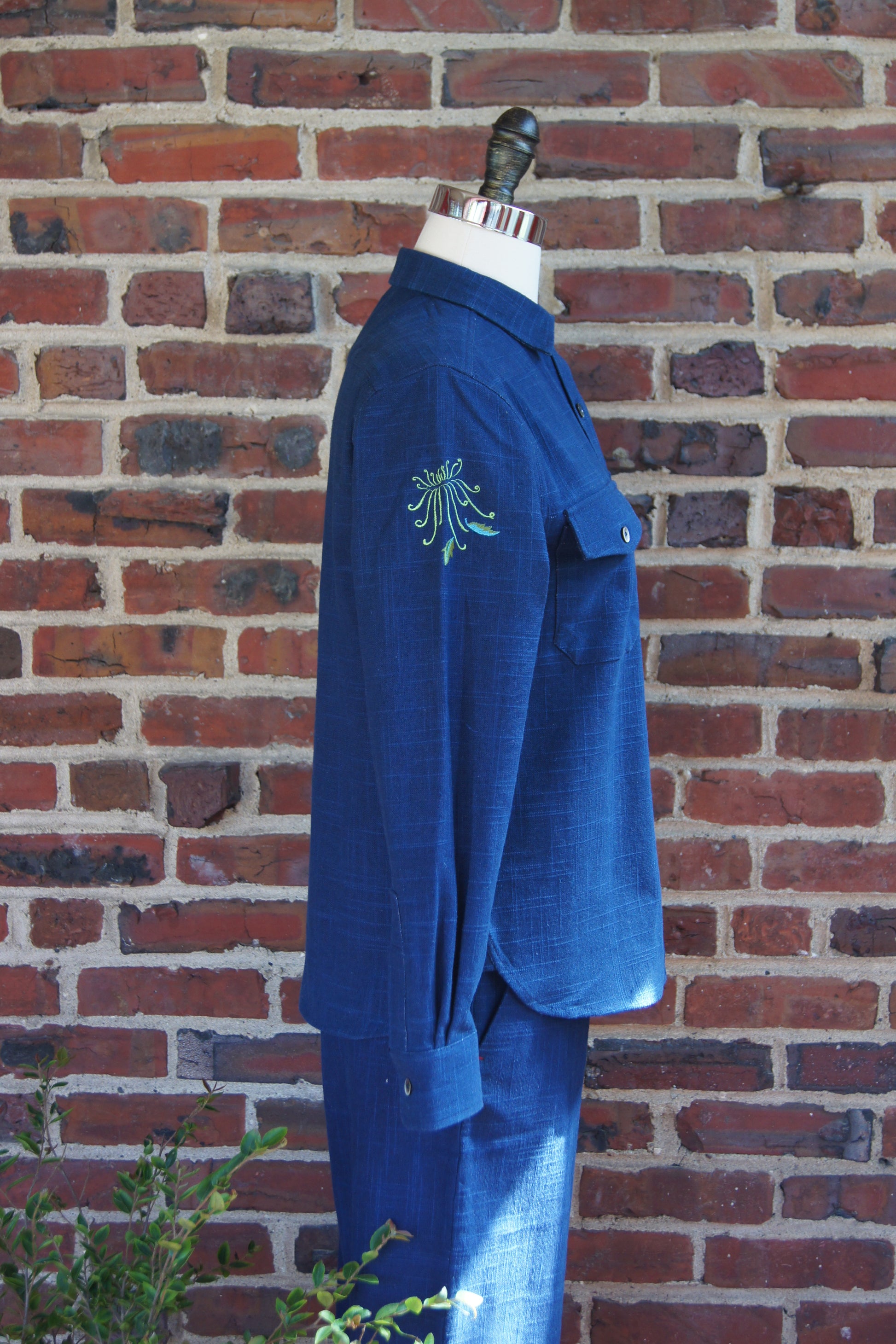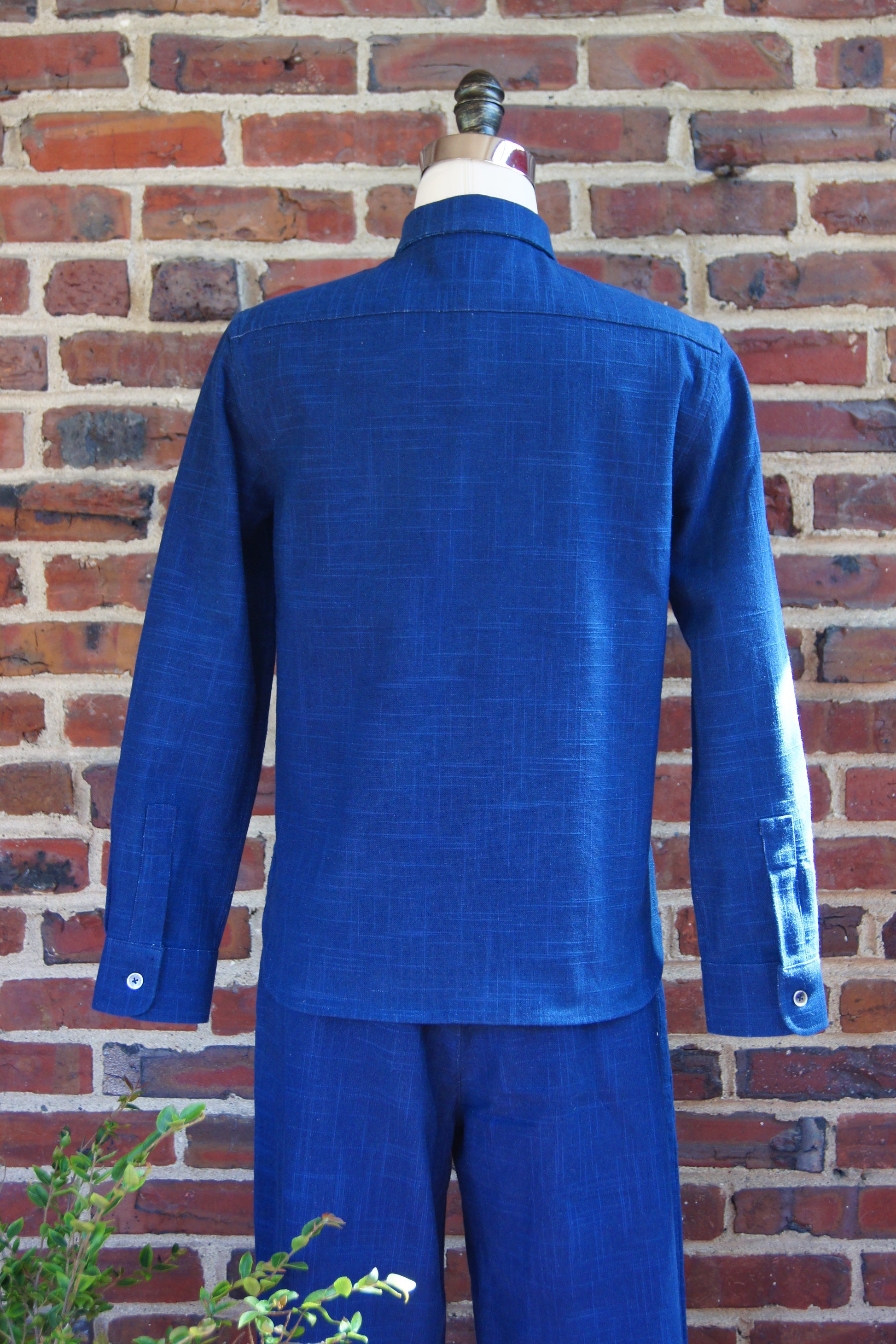 Fabric: Plant dyed fabrics are dyed entirely from naturally grown plants-no synthetic dyestuffs or additives. The origin plant, Persicaria tinctorial, has been used since ancient times as textile dyestuffs and natural medicine. So our plant dyes are good for our health and the health of the planet. Our sustainable alternative to denim, because of the natural origin of the dyes, will age beautifully and become your unique piece. Want to learn more about plant dyed fabrics? See our blog article “Back to the Future”- The story of Plant Dyes” in our Lotus & Michael blog.